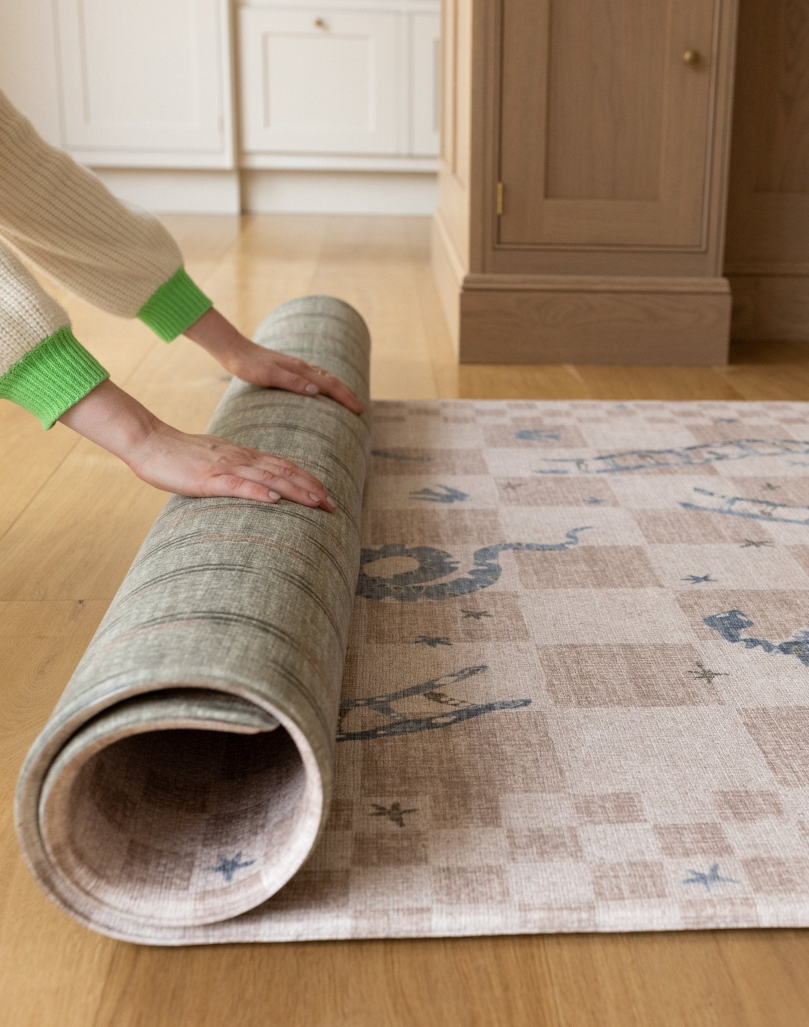 A modern classic reimagined, The Charmer offers a pared-back take on the nostalgic snakes + ladders board game. Created in versatile tones, the design is playful with hand drawn motifs, while also sleek + contemporary, anchored by a simple checker border. Made from luxury memory foam, it's the comfiest spot in the home for family games, play and so much more.