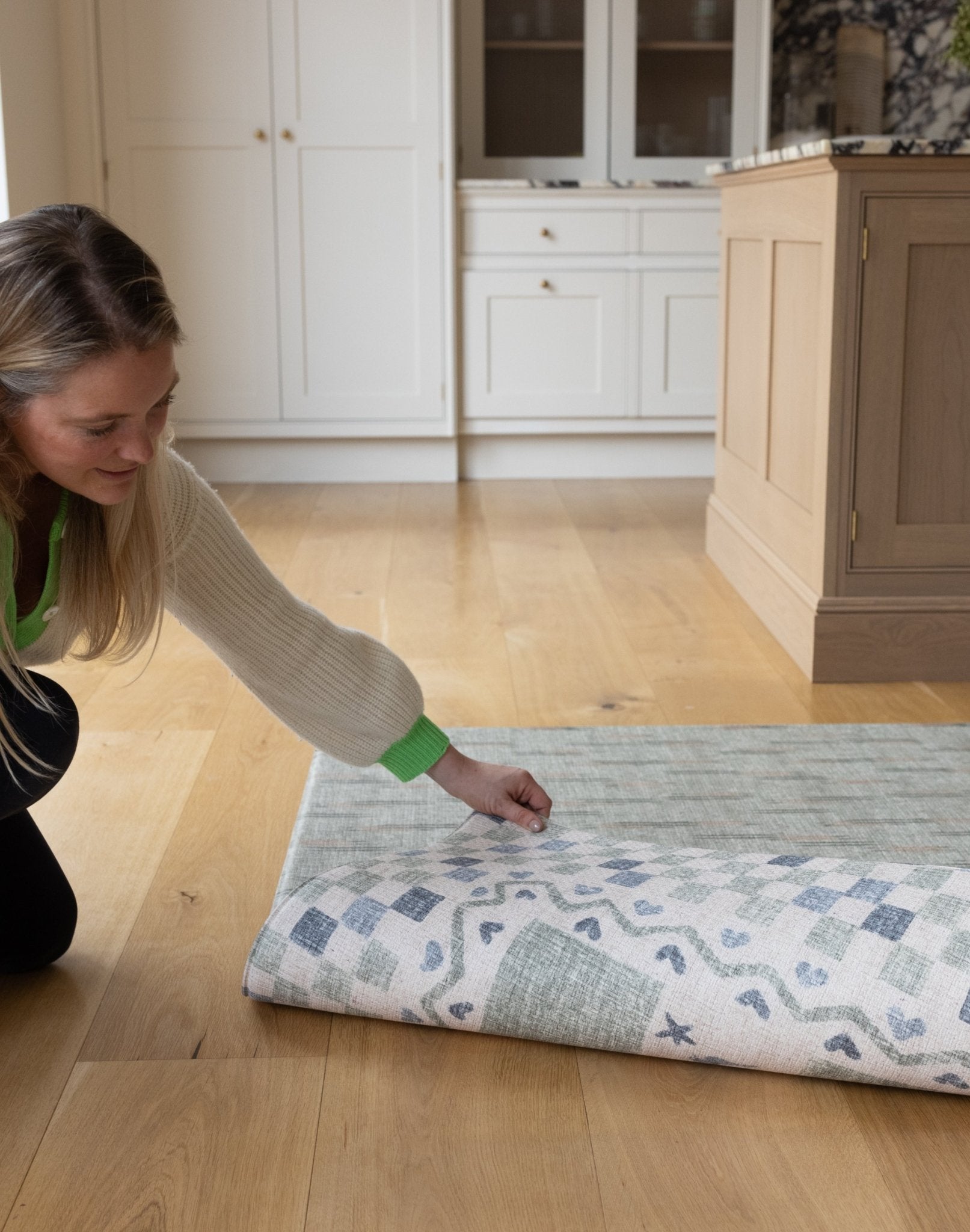 Our luxury baby play mats, ideal as nursery decor and practical area rugs for the family home, are designed in fresh hues to complement modern schemes. Our Greens + Blues collection fit refreshingly into different interior decor schemes and give your whole family support on the floor, including babies tummy time and mum and dad's exercise.